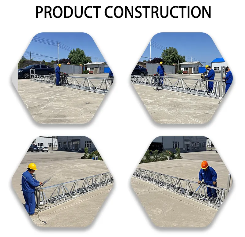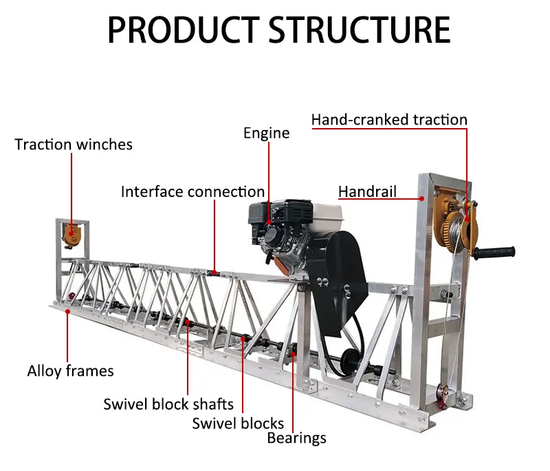 Stabil arbetsmaskin 6 m betonggolvaluminium vibrerande truss -screed -maskin gör att vibrationer, komprimering, slamuttag, skrapning eller bågning av betong kan slutföras på en gång och integriteten i konstruktionen av olika spann kan effektivt realiseras.